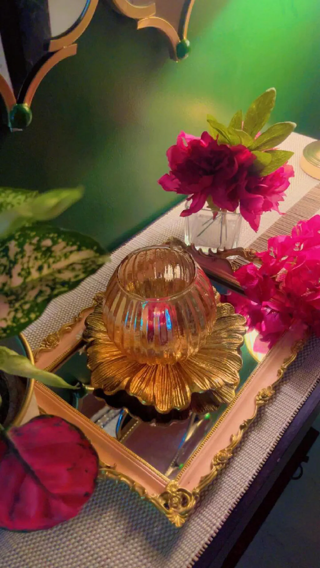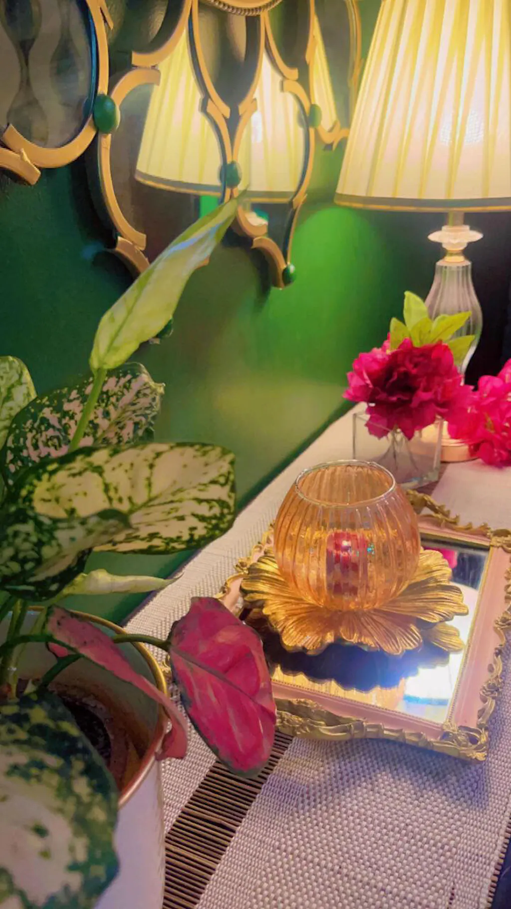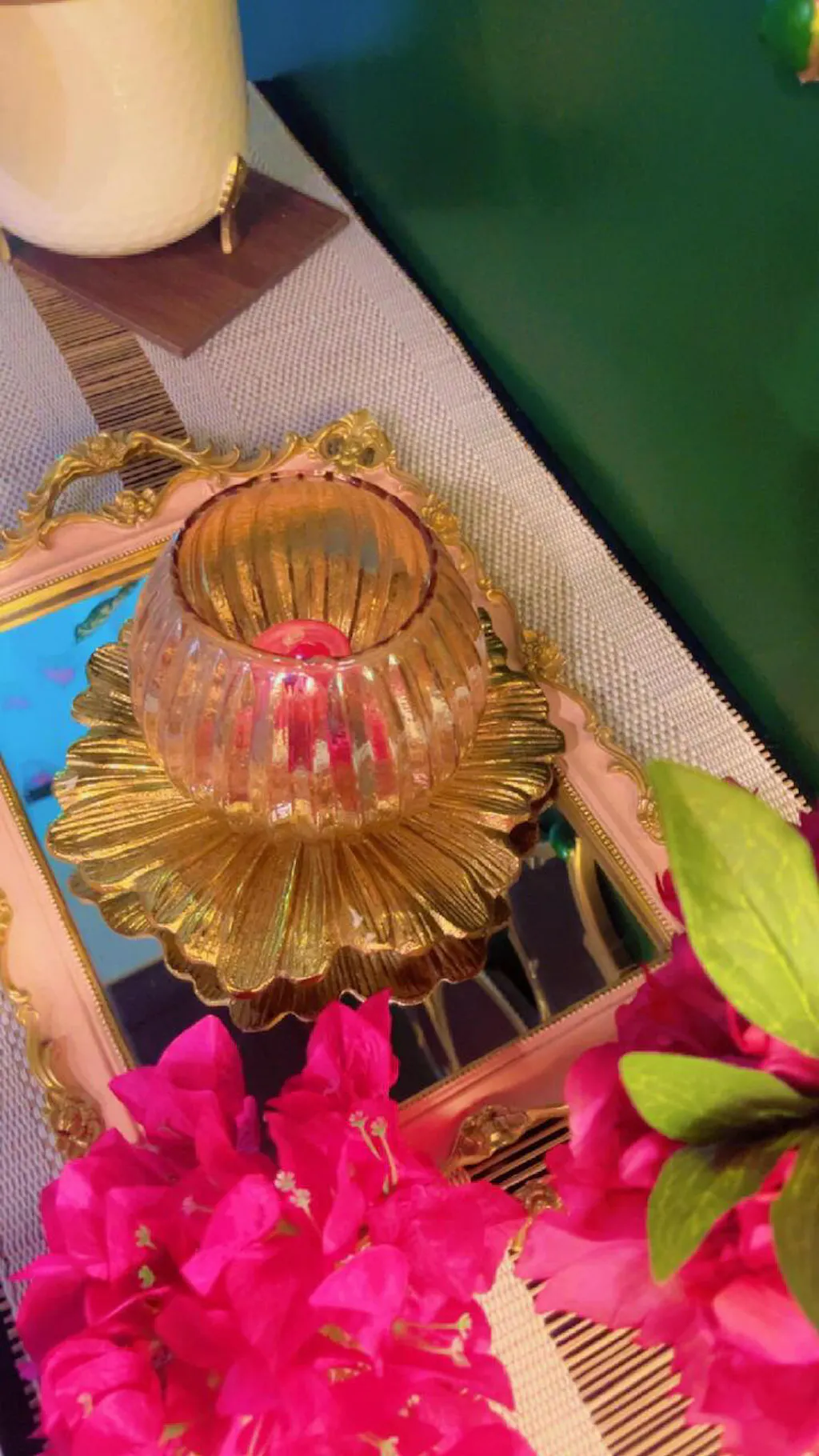Featuring a combination of a glass lamp and a metal flower platter, this piece adds a touch of elegance and charm to any space. The glass lamp beautifully illuminates your table or shelf, casting a warm, inviting glow that instantly creates a cozy ambiance.